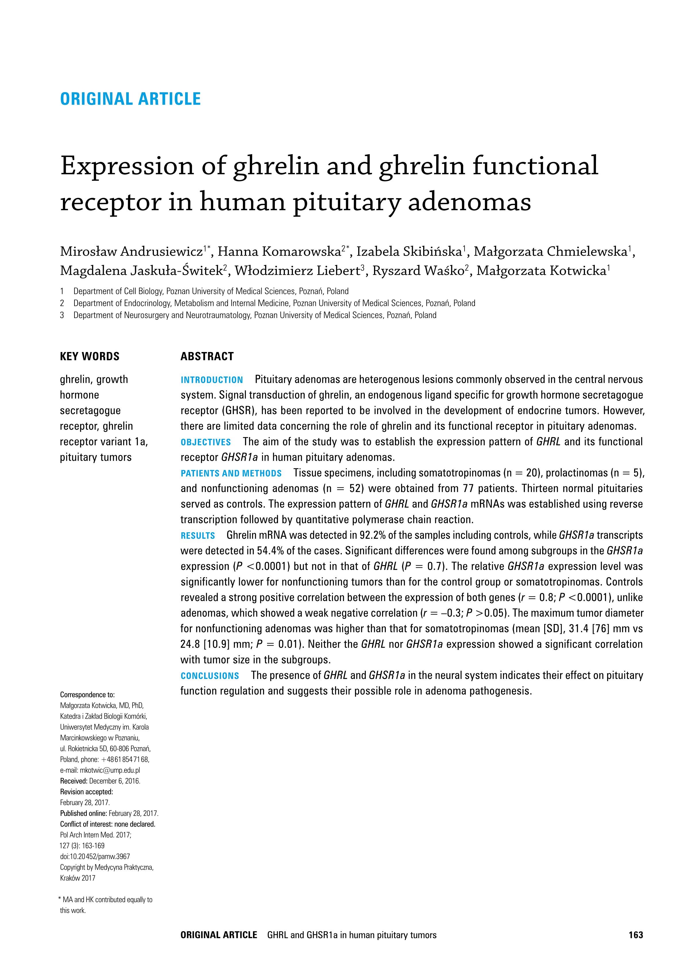 Andrusiewicz M, Komarowska H, Skibińska I, Chmielewska M, Jaskuła-Świtek M, Liebert W, et al. Expression of ghrelin and ghrelin functional receptor GHSR1a in human pituitary adenomas. Polish Arch Med 2017;127:1–7. https://doi.org/10.20452/pamw.3967.